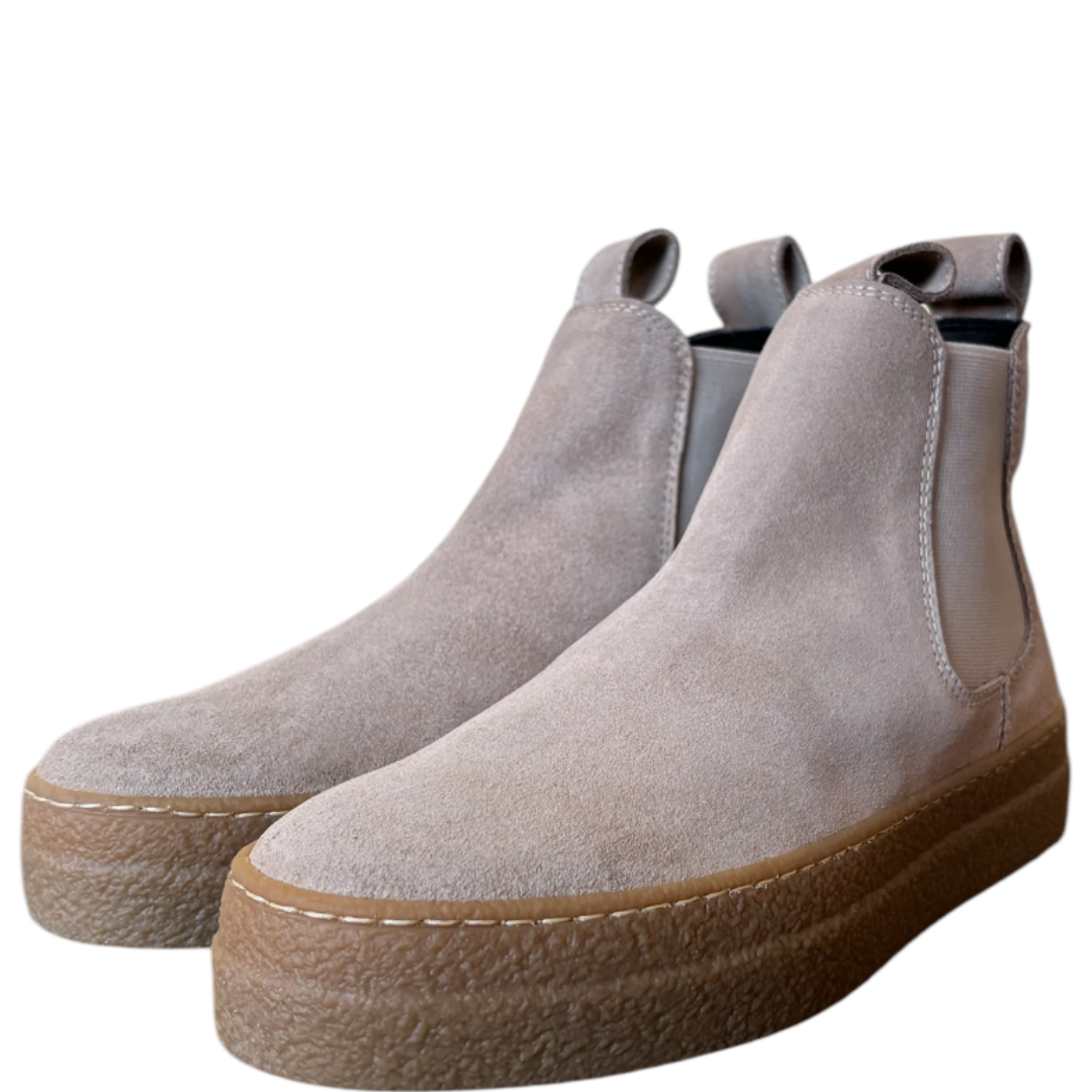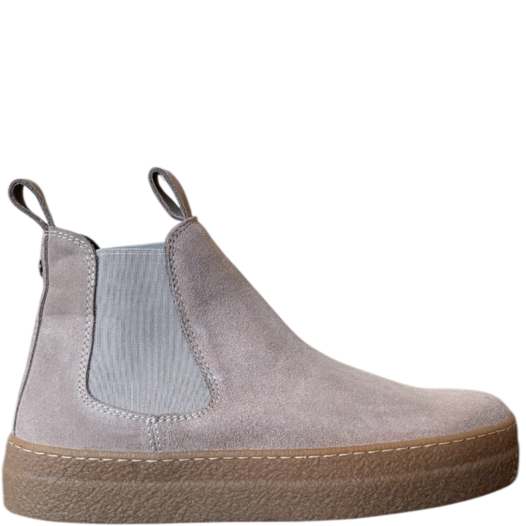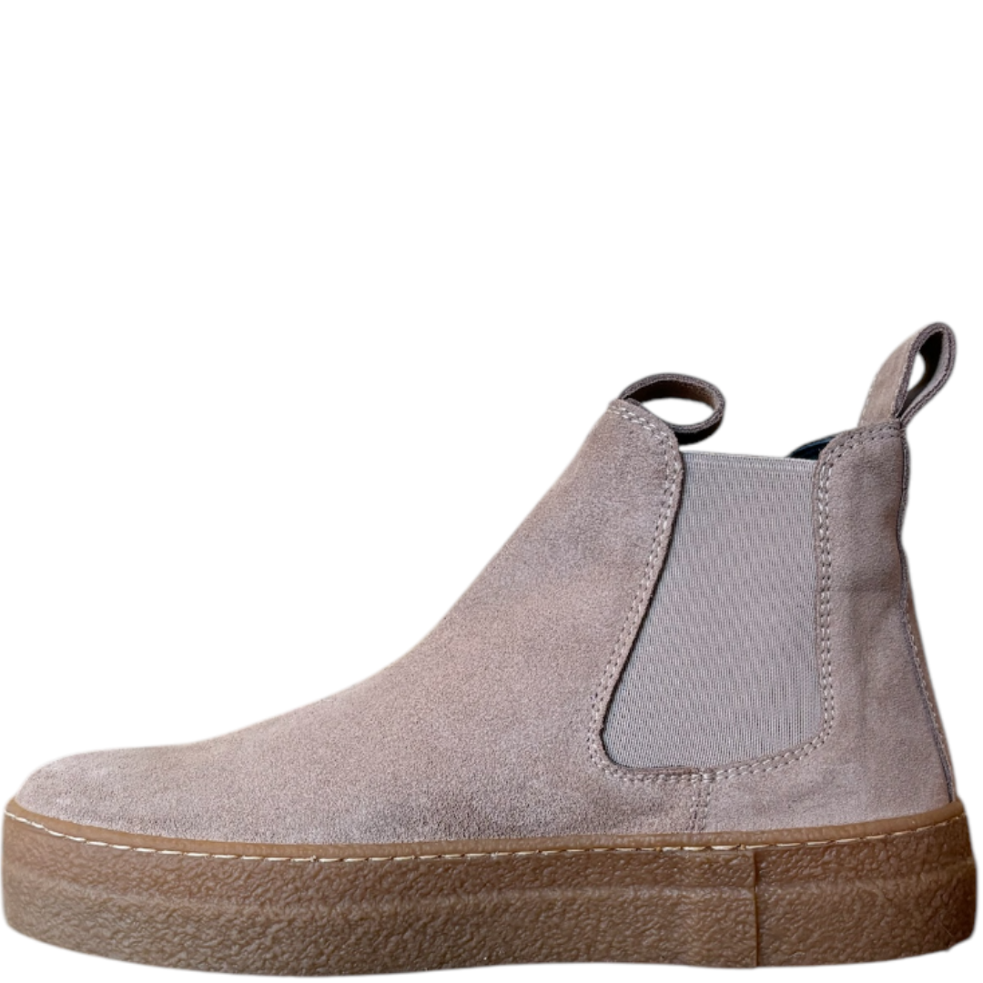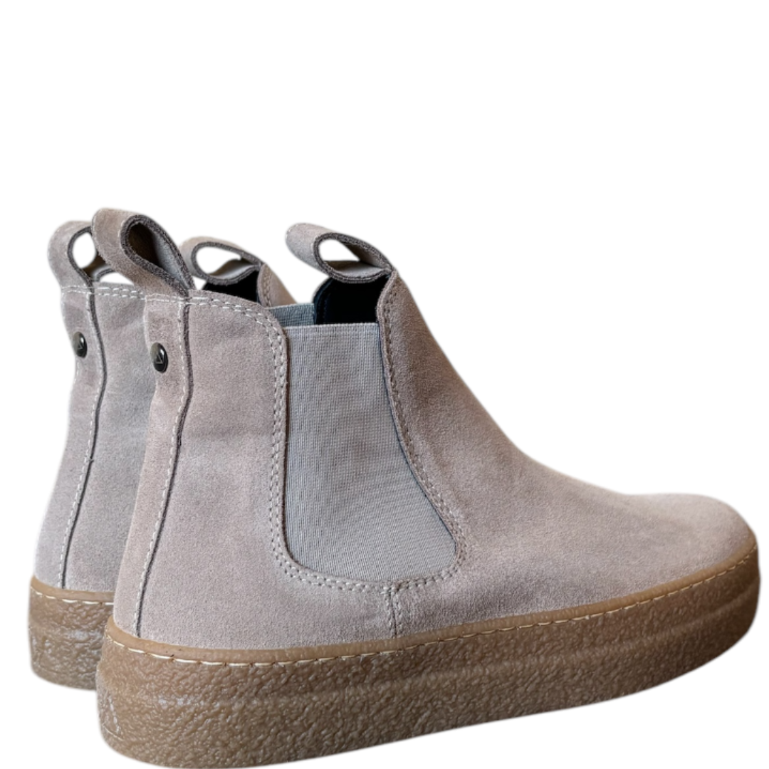 Stivaletti Chelsea da donna in pelle suede con elastici laterali neri e tiranti in pelle per una facile calzata. Made in Italy sostenibile.
